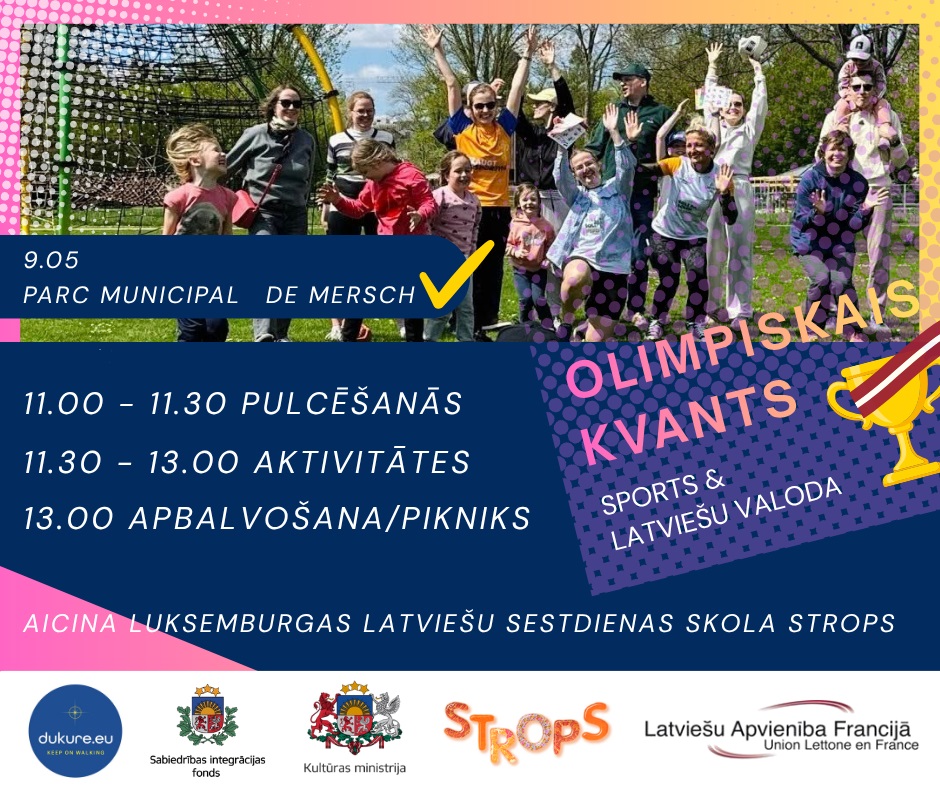 Luksemburgas latviešu sestdienas skola “Strops” 9. maijā aicina gan lielus, gan mazus uz projekta "Olimpiskais kvants" darbnīcu, kas apvieno sportu un aktīvu dzīvesveidu ar latviešu valodas apguvi!