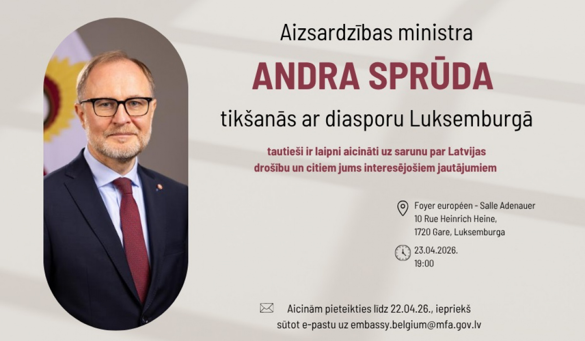 Aicinām visus Luksemburgā dzīvojošos Latvijas valstspiederīgos uz tikšanos ar Latvijas aizsardzības ministru Andri Sprūdu, kas norisināsies 23. aprīlī plkst. 19.00 Foyer centra Adenauer zālē 10 Rue Heinrich Heine, 1720 Gare, Luksemburga.
