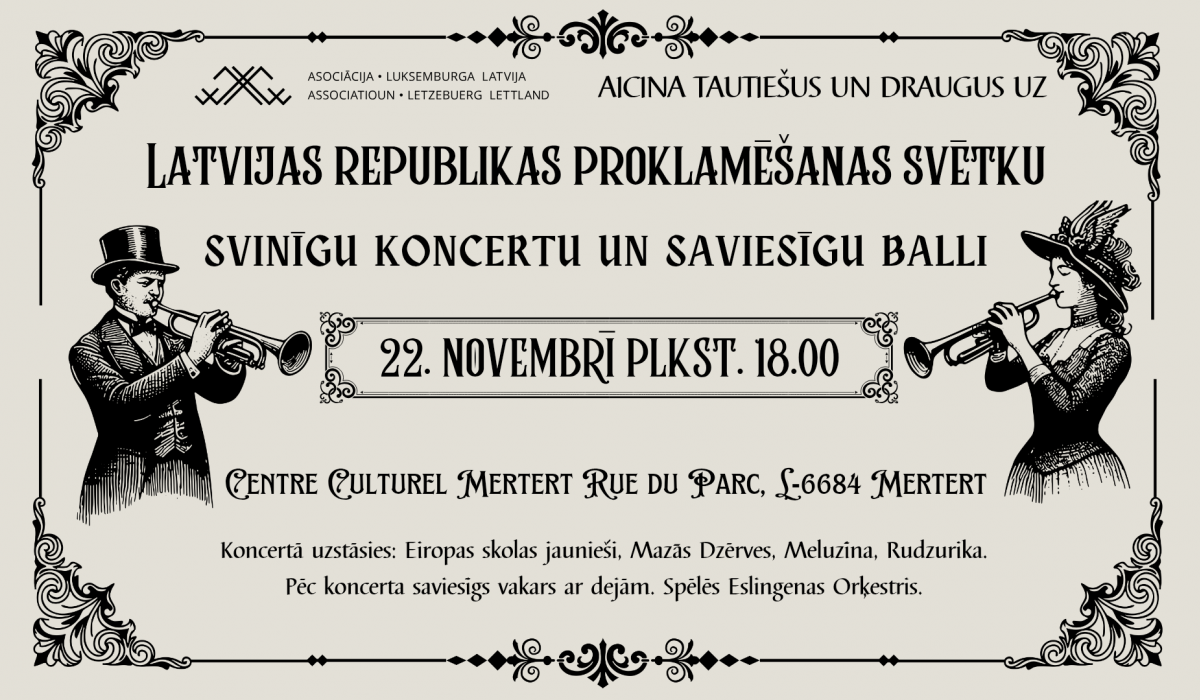 Svinīgais koncerts un balle notiks Mertertas kultūras centrā (adrese: 8 rue du Parc, Mertert, L-6684).